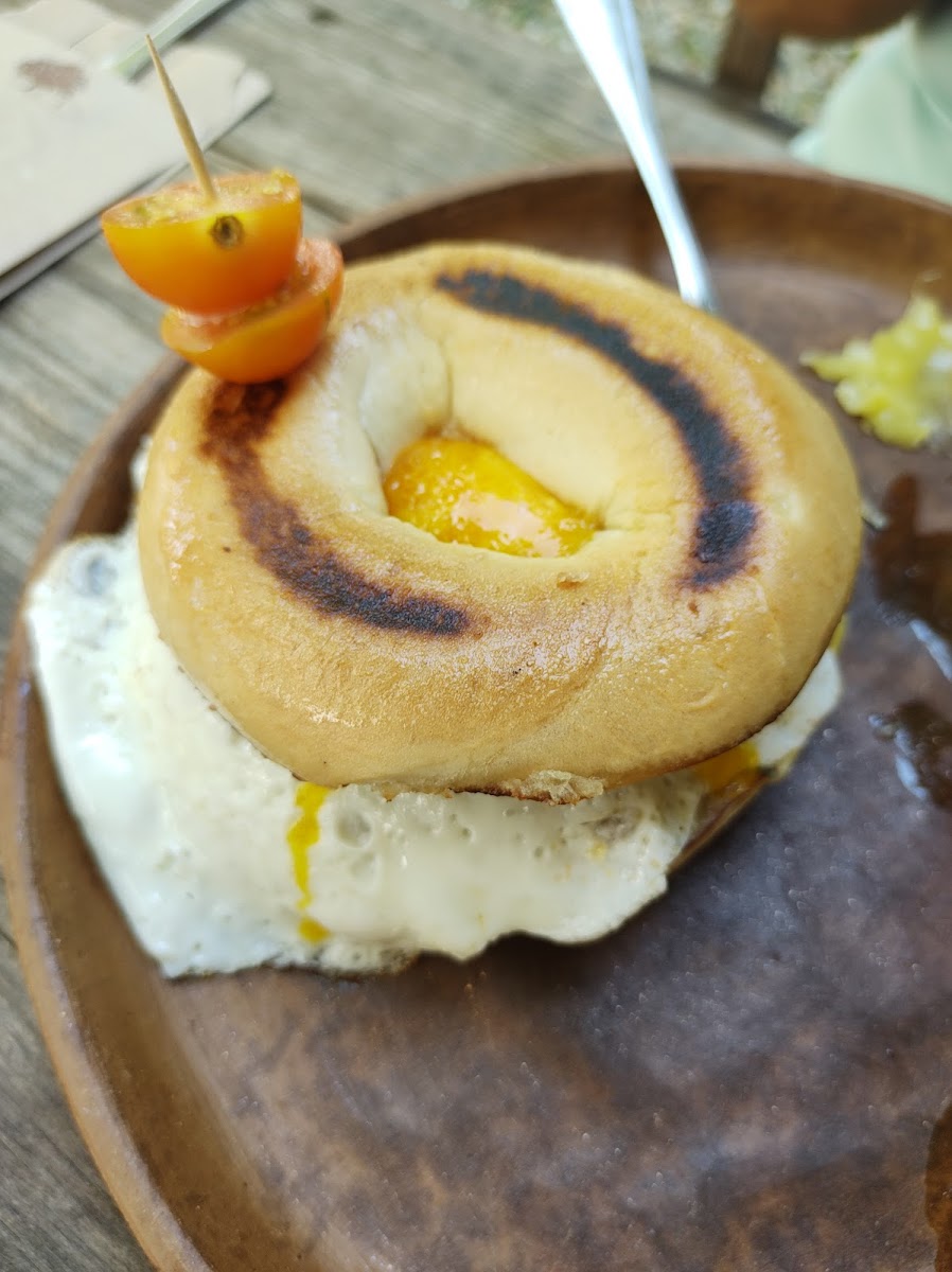 Chill, open air space. Food was delicious! I ordered the French Toast. It had a creme filling. Not too sweet, but the portion was a bit small for the price. Also, the carrot juice was watered down. A good place if you are not in a hurry. Overall still an nice experience!